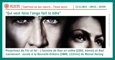 C'est ce soir à 20 h 15 et peut-être un peu ardu d'accès, mais cette soirée Revers vaut le détour. Le Comptoir du Doc, Faire Meute et l'Arvor s'associent pour une projection "QUI VEUT FAIRE L'ANGE FAIT LA BÊTE" (Bad Lieutenant et Fric et foi). Deux films de Werner Herzog qui est un réalisateur, acteur et metteur en scène allemand des années 60-70.