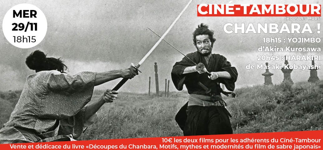 Jeudi soir, au Tambour sur le campus Villejean, le ciné club étudiant et l'Arvor s'associent pour projeter deux films de sabre japonnais, Yojimbo et Harakiri, dont un en 35mm. Ce sera également l'occasion d'acheter et de faire dédicacer un ouvrage universitaire collectif sur ce type de film, le « chanbara », qui est l'équivalent au Japon des œuvres européennes « de cape et d'épée ». (10€ les deux films pour les adhérents du Ciné-Tambour)