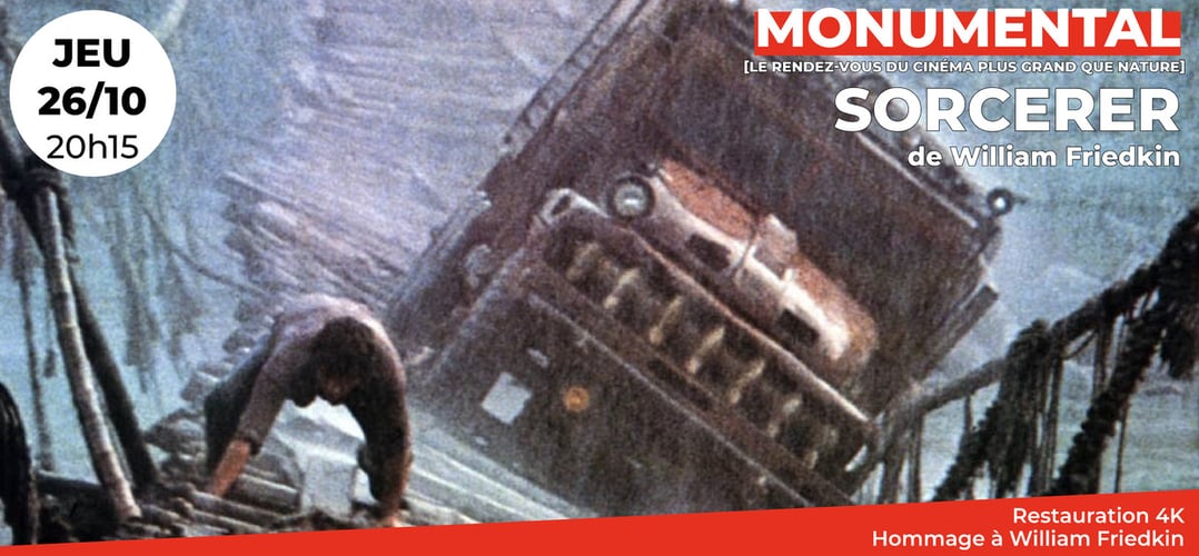 Jeudi 26, séance MONUMENTAL à 20h à l'Arvor, avec Sorcerer (Le Convoi de la peur) de William Friedkin. Un film par le réalisateur de French Connection et L'Exorciste, qui vaut le détour même s'il loupa sa sortie en 1977 face à Star Wars.