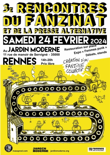 Samedi après-midi, 👥 Mass Prod organise au 📍 Jardin Moderne les 3èmes rencontres du Fanzinat et de la Presse Alternative. Un rendez-vous qui célèbre le D.I.Y. : tout le monde peut se lancer dans la création d'un tel objet. On pourra y rencontrer des fanzines de toute la France et discuter avec leurs auteurs. La nouveauté de cette édition sera la réalisation collective d'un « Fanzine de la Journée du Fanzinat ». Et quitte à aller au Jardin Moderne, pensez à jeter un œil à l'expo Femmes Punks au passage.